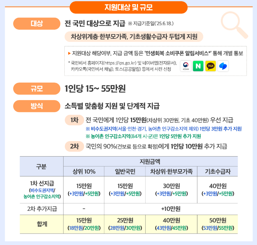민생회복 소비쿠폰은 국민 대다수에게 일정 금액을 지급하여 소비를 유도하고 경기 회복을 돕는 소비 촉진형 지원금입니다.